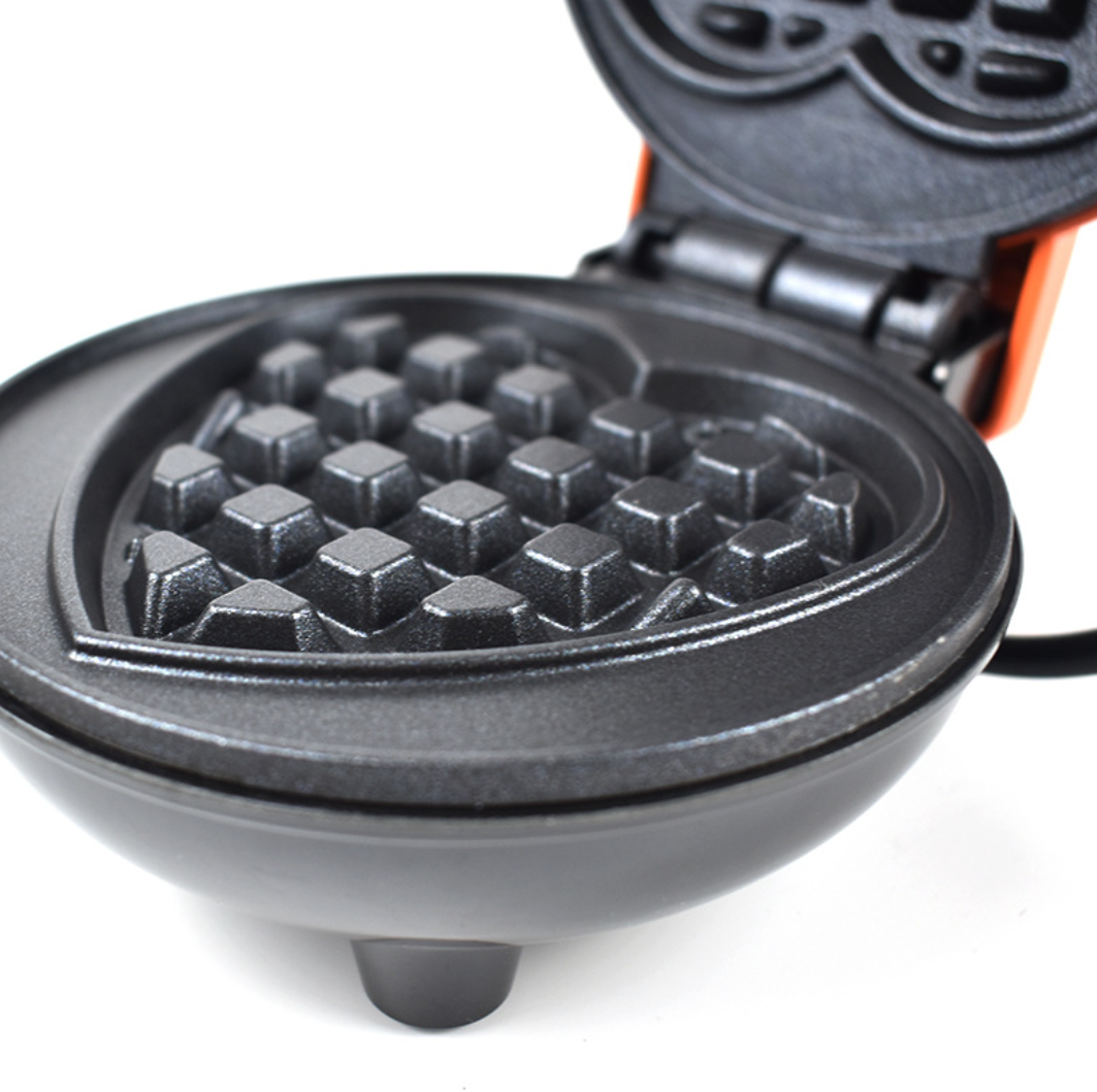 Mini maquina para hacer Wafles en forma de corazón con recubrimiento antiadherente y un diseño de calentamiento doble cara que te permite levantar y retirar los waffles recién cocidos. Una vez fría la mini maquina puedes limpiar fácilmente.